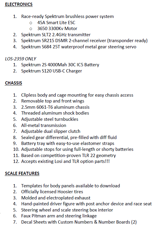 The Losi 22S Sprint delivers superior performance and accurate scale looks at a fraction of the cost, with time-saving, ready-to-run ease. Based on championship-winning Team Losi Racing TLR 22 geometry, it’s filled with the features that experienced racers respect.