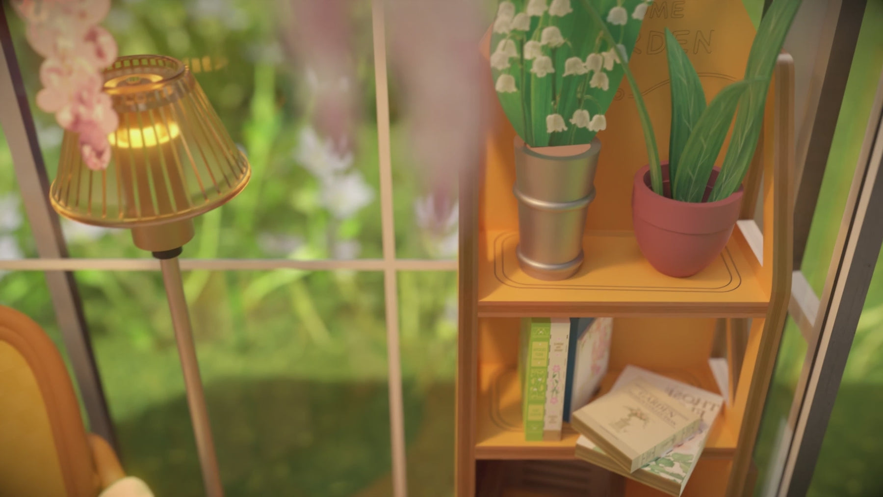 The assembly process of the Holiday Garden House is a joyous journey. The easier difficulty level ensures a fun and engaging experience, while the mortise and tenon process guarantees a closely connected and stable structure. The side window can be opened with a simple push outwards. Surrounding the windows is a beautiful wisteria vine, adding a touch of natural elegance to the space. The touch-sensitive night lights softly illuminate the surroundings.