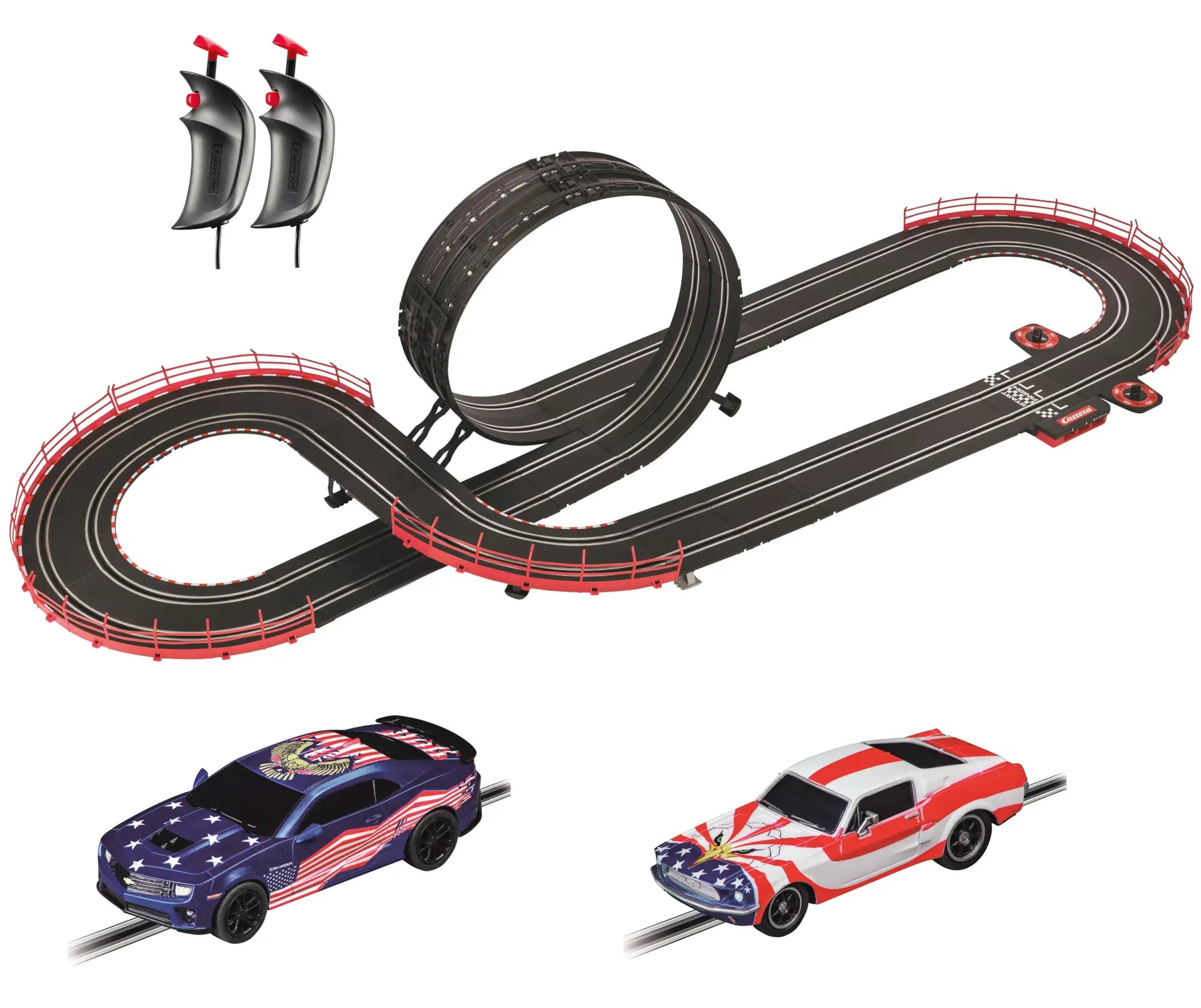 Race head-to-head with this high-speed, Carrera GO!!! 1:43 scale analog slot car racing toy set featuring two iconic muscle cars! The Carrera GO!!! slot car racing system offers big fun in a smaller scale. Each set comes with everything you need to start racing and having fun. Hitting scaled speeds of up to 370-mph is no problem for the popular cars as they speed around this 16.08-ft. long track. This set includes a lap counter for keeping track of the leader and a loop for even more challenge and excitement! Rated for ages 6 and up, kids and adults alike will get countless hours of fast racing fun! Carrera GO!!! slot car racing sets are compatible with all Carrera GO!!! cars and track accessories allowing you to customize and expand for even more racing fun. Cars included are Officially Licensed Ford Mustang '67 - Stars 'n Stripes and Chevrolet Camaro - Stars 'n Stripes cars.