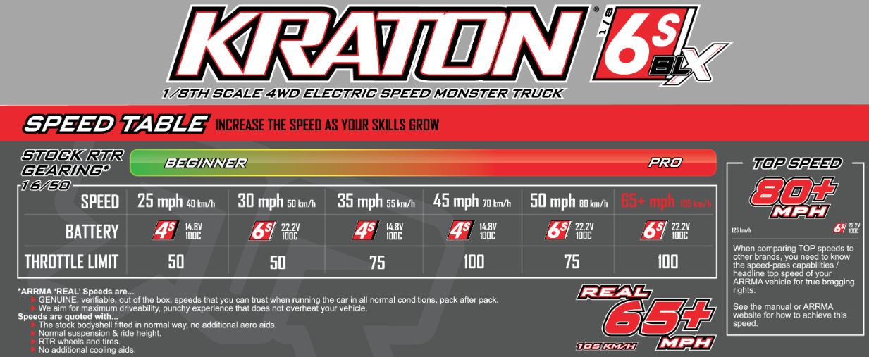 Take the ready-to-run KRATON 6S BLX 4X4 blasting on any terrain, including asphalt, dirt, gravel, or short grass. Set up some ramps or build a few mounds in the dirt — set a new long distance record every time you jump. With your choice of 4S or 6S battery and charger, you’ll have everything you need for speed monster truck thrills the way only ARRMA makes them.