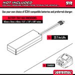 The durable chassis is ventilated to keep on-board components cool. Large side guards offer more protection from dirt. Stealth monochrome electronics are included for good looks, and the battery straps adjust to accept your choice of 2S LiPo hardcase battery.